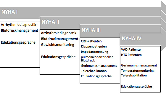 Am Beispiel der Herzinsuffizienz zeigt die folgende Abbildung, wie "DEGEDI - Telemed" Patienten über den gesamten Verlauf von akuten und chronischen Erkrankungen begleitet.